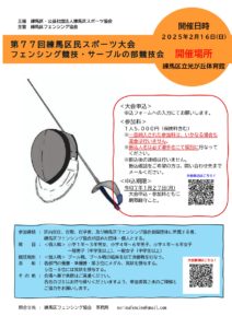 第77回練馬区民スポーツ大会 フェンシング(サーブル)競技会の ご案内をさせていただきます。 詳細については、添付されている要項をクリックしご確認をお願い致します。